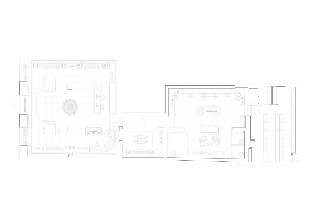 The 195 sqm flagship at 28 Fuencarral Street channels Hollywood mansion hedonism as an open house for Nude Project’s creative community. The journey unfolds through three distinct rooms connected by fluid circulation. The entrance hall features a circular counter with backlit logo, lounge seating, and a curved library showcasing brand objects. Terrazzo flooring in soft white and green tones establishes vintage character. The music room houses vinyl collections within floor-to-ceiling wood shelving, complemented by sculptural speakers and green leather chairs beneath a velvet ceiling. The game room merges the fitting area with a poker table display, where wood paneling morphs into curved shelving. Baby blue flooring and stainless steel details create dynamic reflections, while backlit coffered ceilings add cinematic depth to this urban sanctuary.